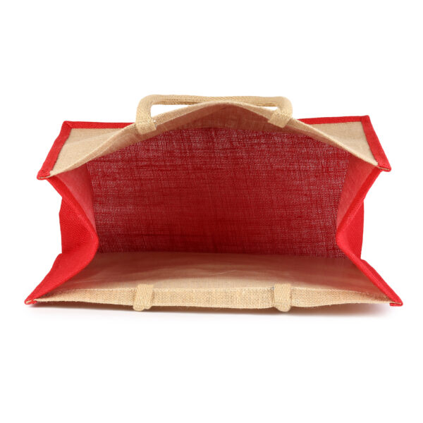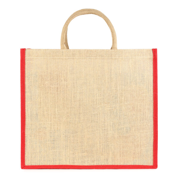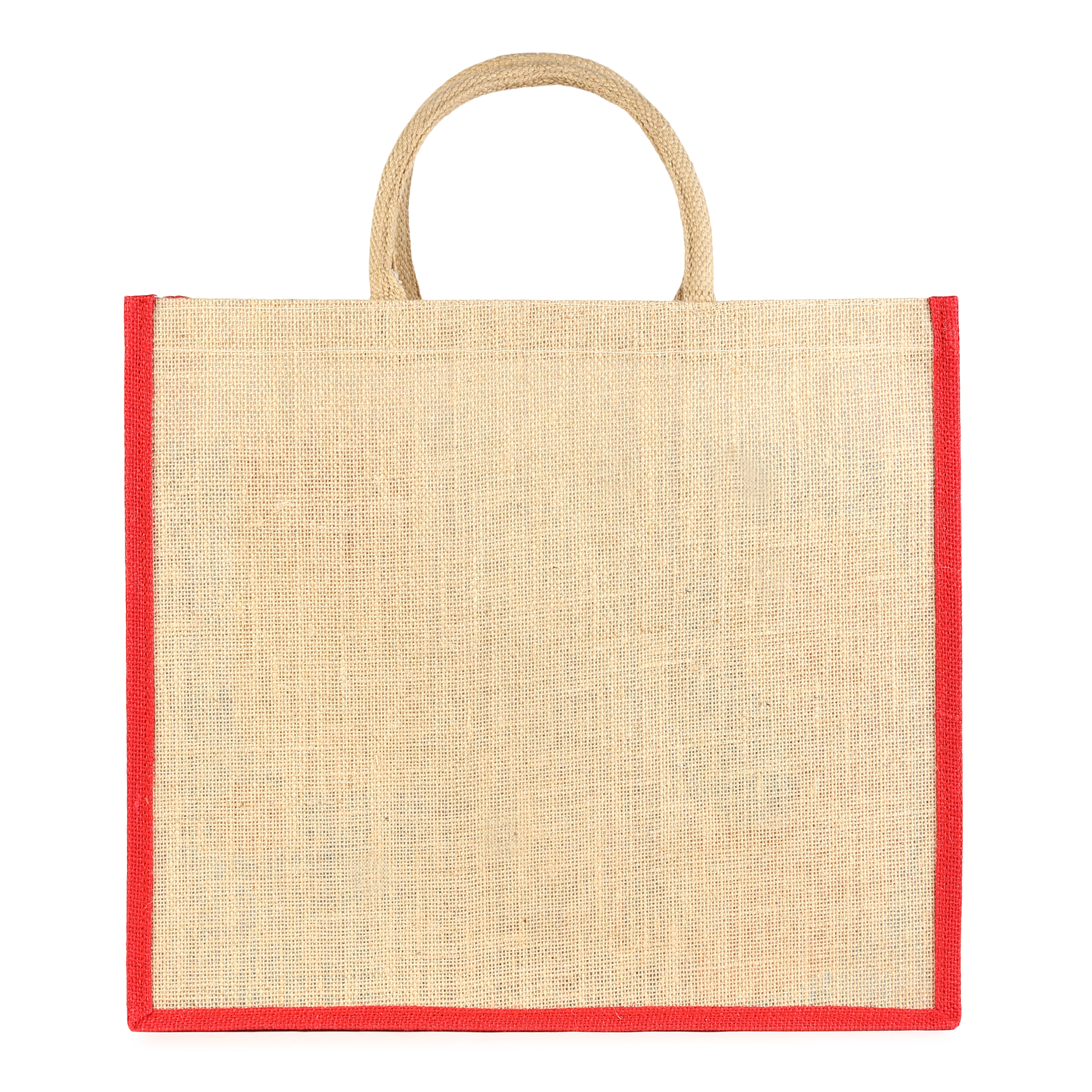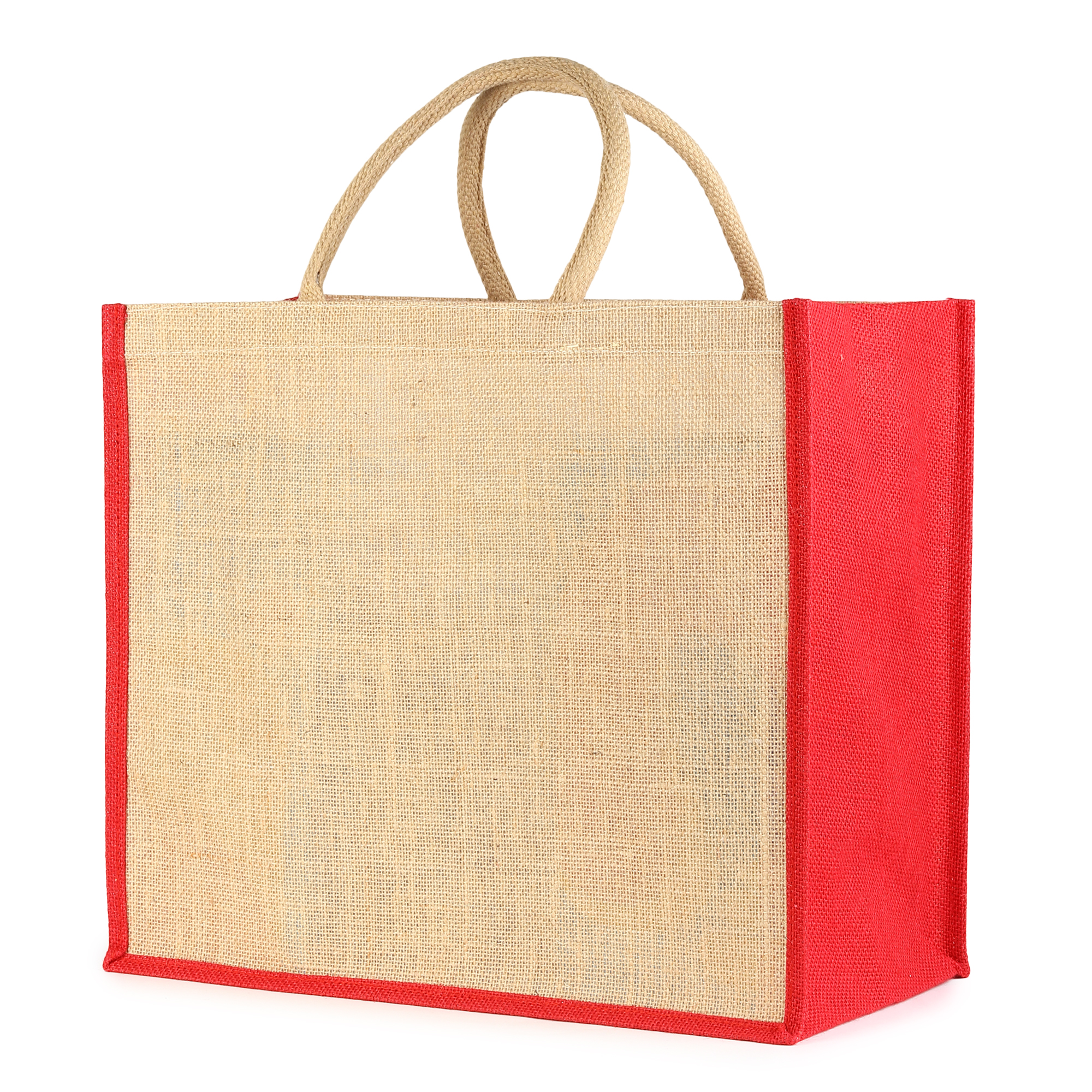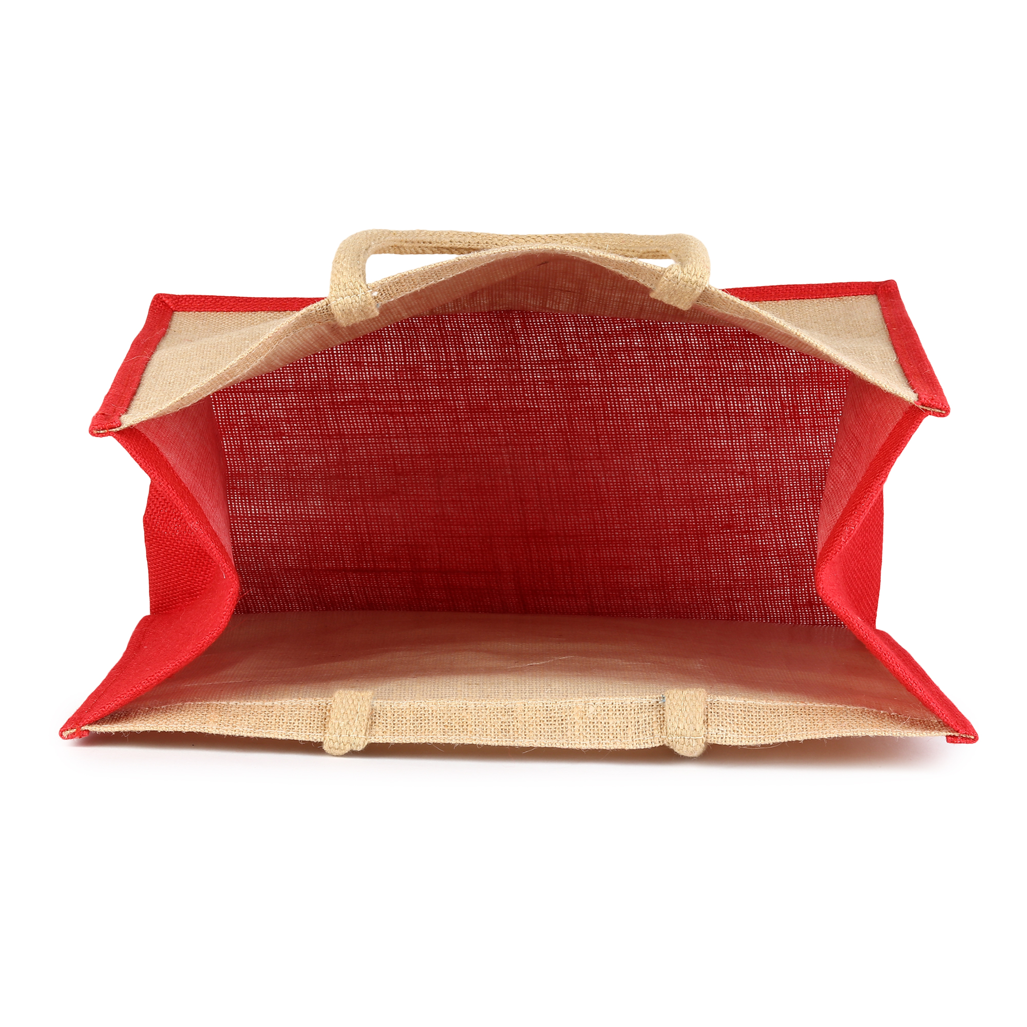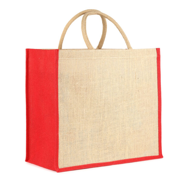 This large-sized shopping bag is crafted from premium laminated jute, blending natural and colored jute panels for a stylish and eco-friendly look. The front and back are made of natural jute, while the sides feature colored jute, adding a vibrant touch that can be customized according to the customer’s choice.